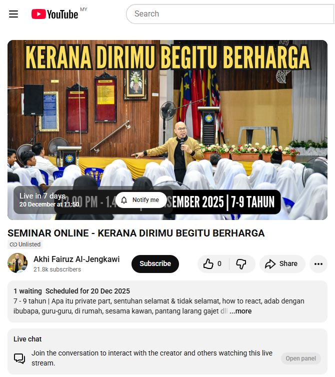 “Program Terbaik Seminar Online Untuk Anak-anak. Jom Sertai Seminar Bersama Akhi Fairuz Livestream Di Youtube!“